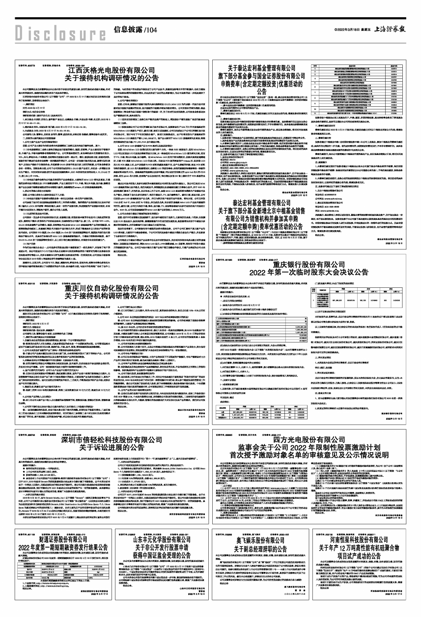 江西沃格光电股份有限公司(以下简称“公司”)于2022年3月17日通过电话会议交流形式接待了机构调研,现将情况公告如下: