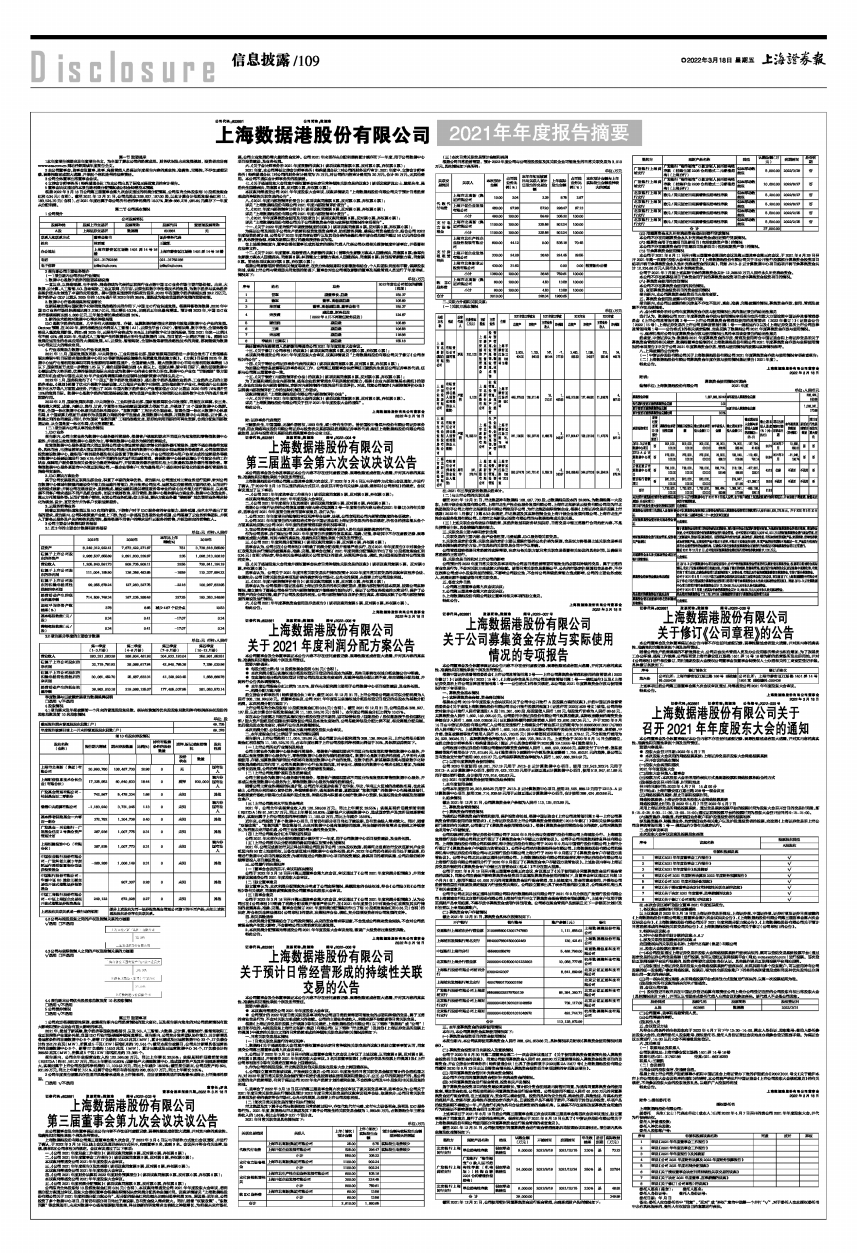 以上议案请见2022年3月18日在上海证券交易所网站、上海证券报、中国证券报、证券时报及证券日报披露的《上海数据港股份有限公司第三届董事会第九次会议决议公告》、《上海数据港股份有限公司第三届监事会第六次会议决议公告》、《上海数据港股份有限公司关于2021年度利润分配方案公告》、《上海数据港股份有限公司关于预计日常经营形成的持续性关联交易的公告》、《上海数据港股份有限公司关于修订〈公司章程〉的公告》。