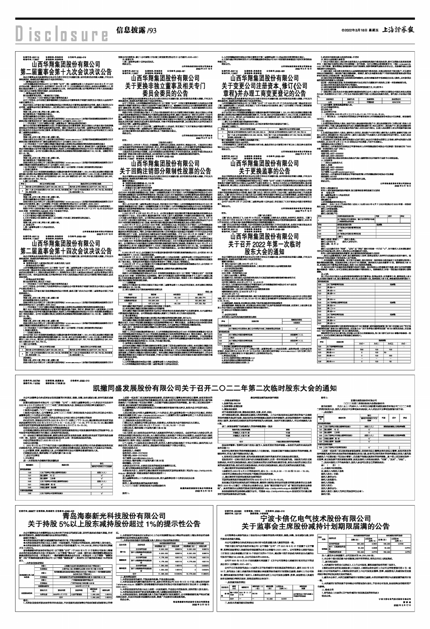 山西华翔集团股份有限公司(以下简称“公司”)第二届董事会第十九次会议于2022年3月17日在公司办公楼二楼会议室召开。会议通知于2022年3月11日以直接送达方式发出。会议应出席董事9人,实际出席会议董事9人,会议由董事长王春翔先生主持。本次会议的召集、召开程序符合《中华人民共和国公司法》及《公司章程》等有关规定,会议合法有效。