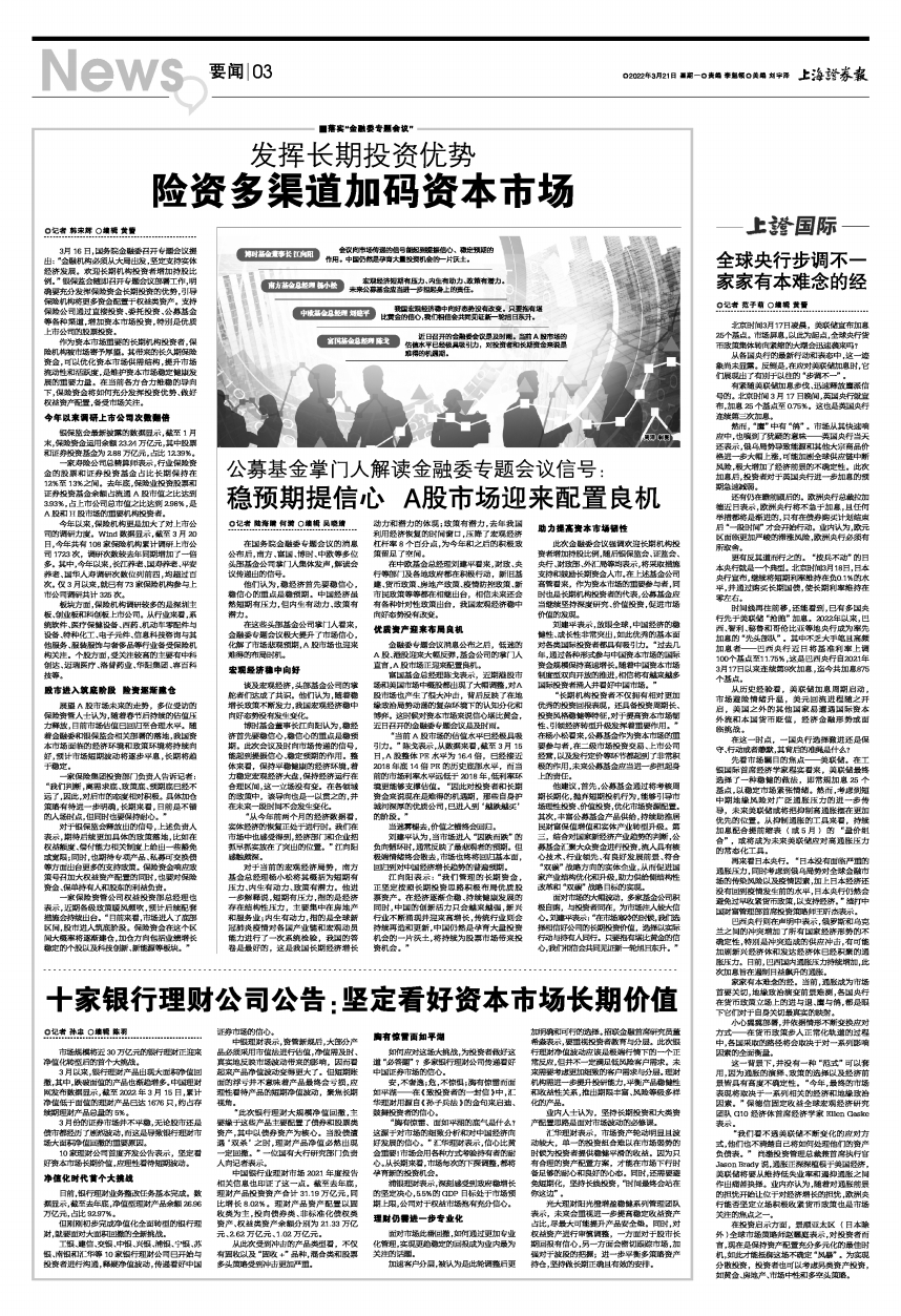 3月16日,国务院金融委召开专题会议提出:“金融机构必须从大局出发,坚定支持实体经济发展。欢迎长期机构投资者增加持股比例。”银保监会随即召开专题会议部署工作,明确要充分发挥保险资金长期投资的优势,引导保险机构将更多资金配置于权益类资产。支持保险公司通过直接投资、委托投资、公募基金等各种渠道,增加资本市场投资,特别是优质上市公司的股票投资。