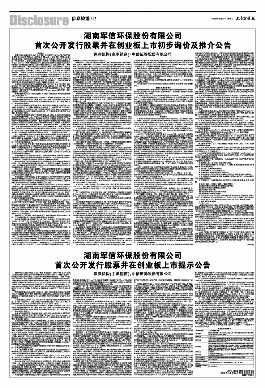 湖南军信环保股份有限公司(以下简称“军信股份”、“发行人”或“公司”)首次公开发行股票并在创业板上市的申请已经深圳证券交易所(以下简称“深交所”)创业板上市委员会审议通过,并已经中国证券监督管理委员会(以下简称“中国证监会”)证监许可〔2022〕254号文同意注册。《湖南军信环保股份有限公司首次公开发行股票并在创业板上市招股意向书》及附件披露于中国证券监督管理委员会指定网站(巨潮资讯网,网址www.cninfo.com.cn;中证网,网址www.cs.com.cn;中国证券网,网址www.cnstock.com;证券时报网,网址www.stcn.com;证券日报网,www.zqrb.cn),并置备于发行人、深交所、本次发行保荐机构(主承销商)中信证券股份有限公司(以下简称“中信证券”或“保荐机构(主承销商)”)的住所,供公众查阅。