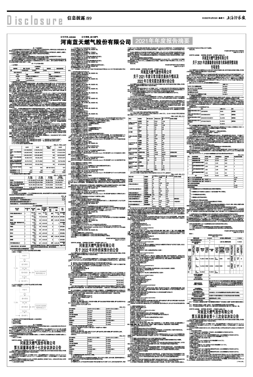 具体内容详见披露于上海证券交易所(www.sse.com.cn)的《蓝天燃气2021年年度报告》《蓝天燃气2021年年度报告摘要》。