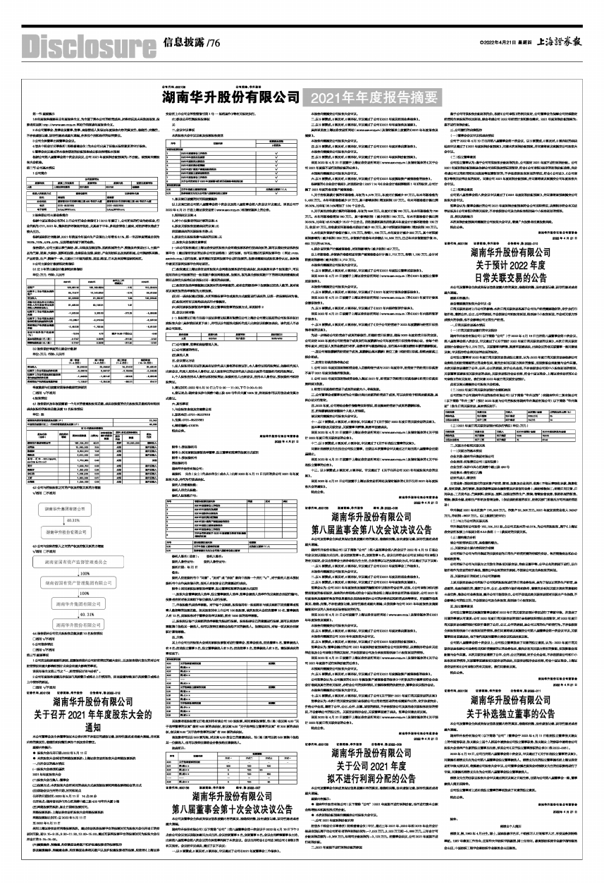 湖南华升股份有限公司(以下简称“公司”)第八届监事会第八次会议于2022年4月19日在公司会议室以现场方式召开。会议应到监事5名,实到监事5名。会议召开符合《公司法》和公司《章程》的有关规定。会议由监事会主席余命根先生主持,全体监事以记名投票表决方式,审议通过了以下议案: