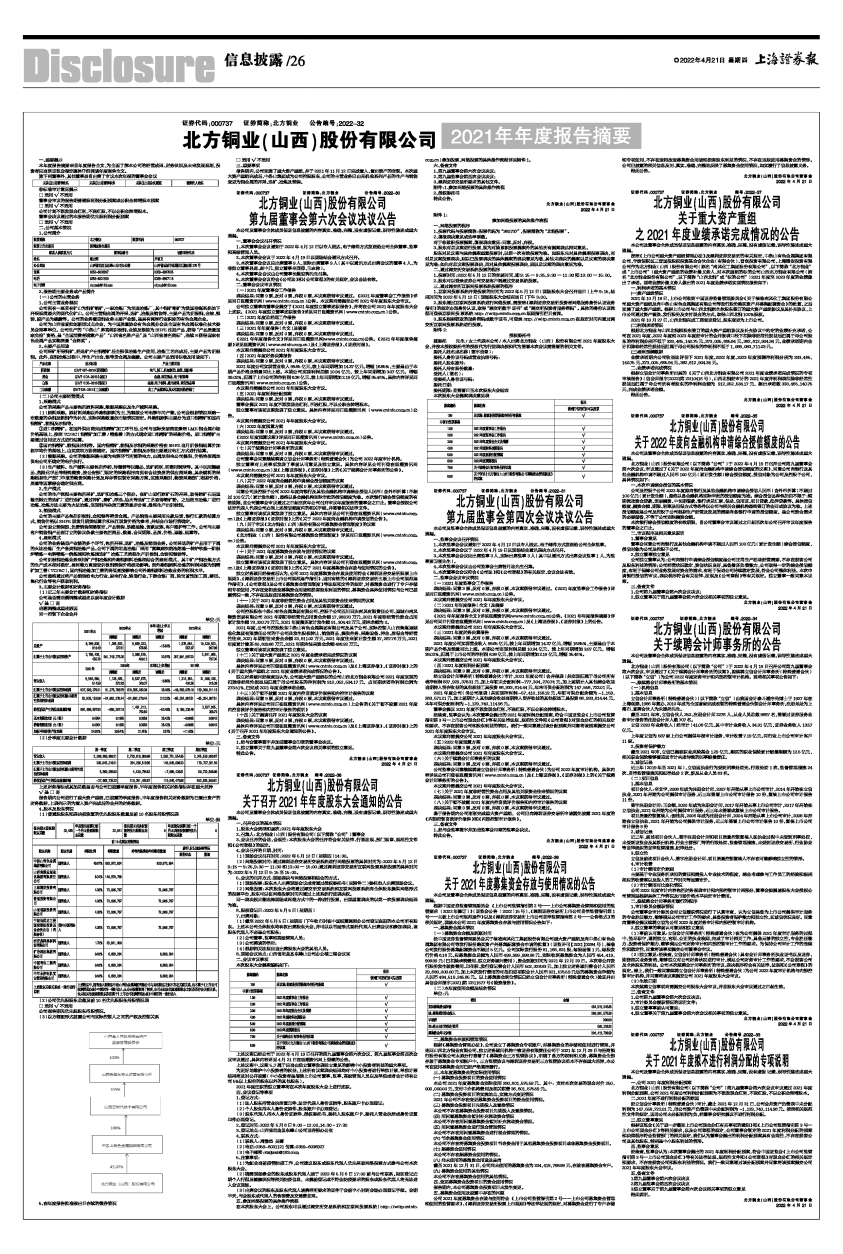 北方铜业(山西)股份有限公司(以下简称“公司”)第九届董事会第六次会议审议通过2021年度利润分配预案,公司2021年度公司利润分配预案为不派发现金红利,不送红股,不以公积金转增股本。