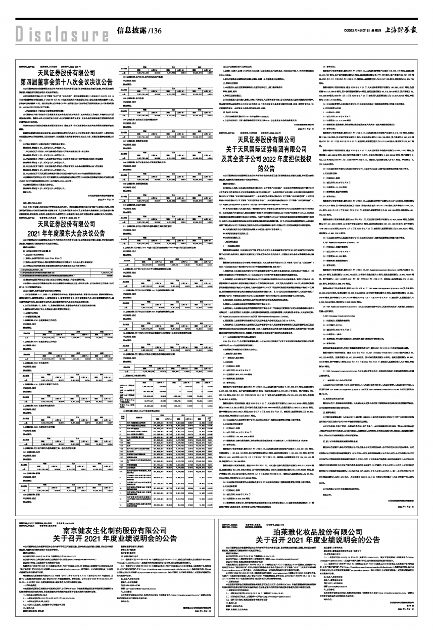 1、天风证券股份有限公司2021年年度股东大会决议;