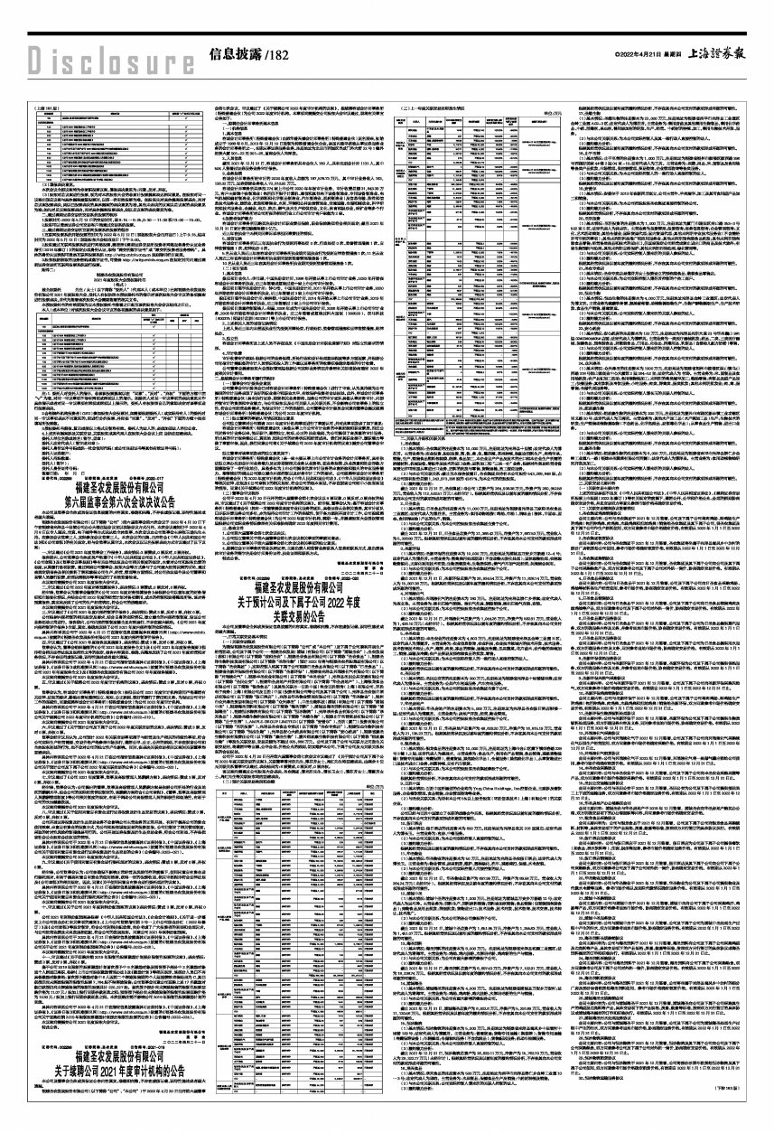 具体内容详见公司于2022年4月21日在公司指定信息媒体《证券时报》、《中国证券报》、《上海证券报》、《证券日报》和巨潮资讯网(http://www.cninfo.com.cn)披露的《福建圣农发展股份有限公司关于预计公司及下属子公司2022年度关联交易的公告》(公告编号:2022-020)。