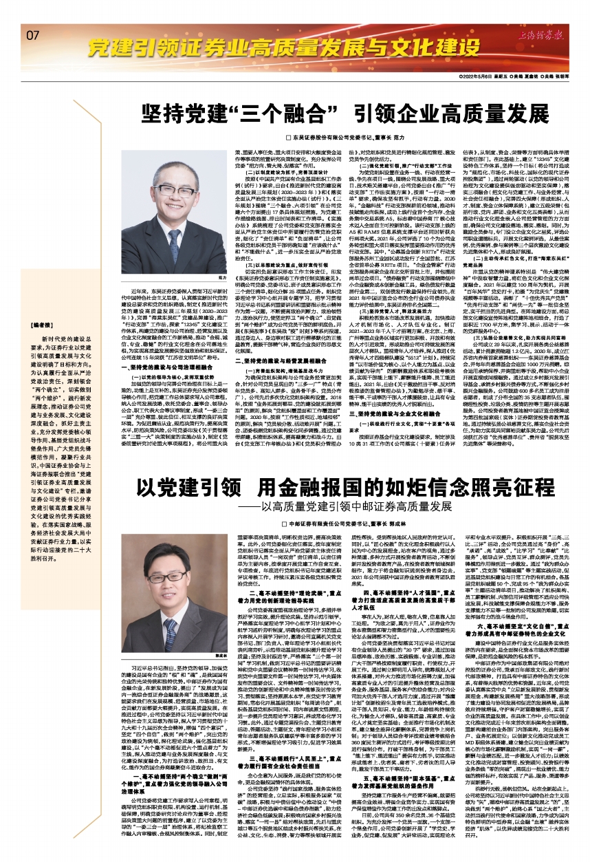 新时代党的建设总要求,为证券行业以党建引领高质量发展与文化建设明确了目标和方向。为认真履行全面从严治党政治责任,深刻领会“两个确立”,切实做到“两个维护”,践行新发展理念,推动证券公司党建与业务发展、文化建设深度融合,抓好主责主业,充分发挥党委核心领导作用、基层党组织战斗堡垒作用、广大党员先锋模范作用,凝聚行业共识,中国证券业协会与上海证券报联合推出“党建引领证券业高质量发展与文化建设”专栏,邀请证券公司党委书记分享党建引领高质量发展与文化建设的优秀实践经验,在落实国家战略、服务经济社会发展大局中贡献证券行业力量,以实际行动迎接党的二十大胜利召开。