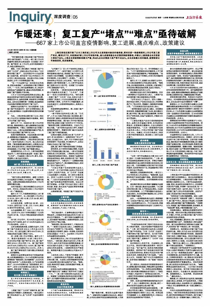 “你们媒体知道上海具体复工复产的时间表吗?我们很迷茫!”5月初,一家上海上市公司的董事长接收到记者发送的《抗疫复工两手抓!复产难否?@上市公司,这份问卷请查收》后,焦急又期待地反问。