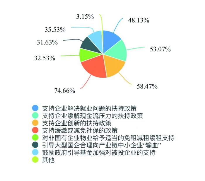 疫情结束后如何帮助企业恢复元气?对此,大部分企业期待政府给予相应的扶持政策。例如,74.66%的企业希望得到支持缓缴或减免社保的政策;58.47%的企业想得到支持企业创新的扶持政策;53.07%的企业想得到缓解现金流压力的扶持政策。(见图六)