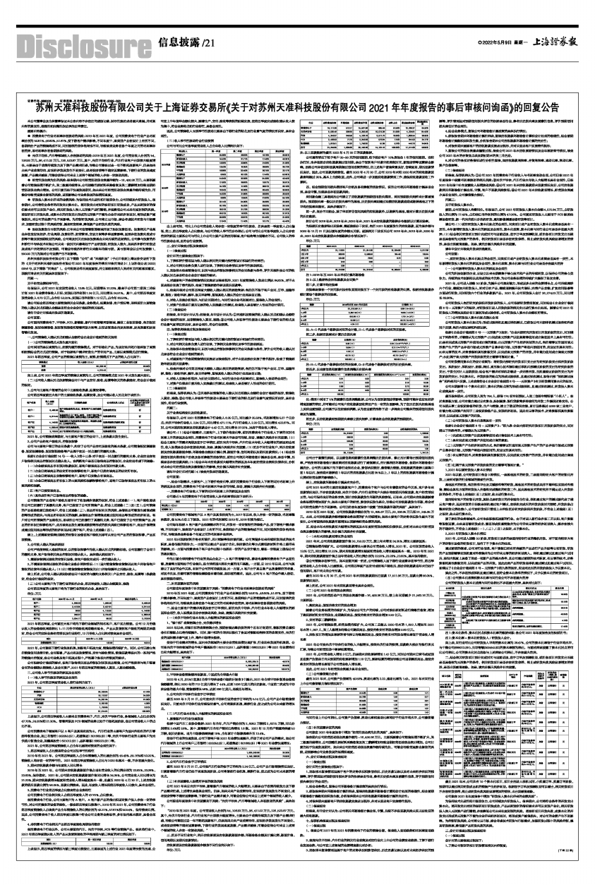 苏州天准科技股份有限公司(以下简称“公司”或“天准科技”)于近日收到上海证券交易所下发的《关于对苏州天准科技股份有限公司2021年年度报告的事后审核问询函》(上证科创公函[2022]0056号,以下简称“问询函”)。公司收到函件后高度重视,并立即组织相关人员对有关问题逐项落实,现就问询函有关问题具体回复如下: