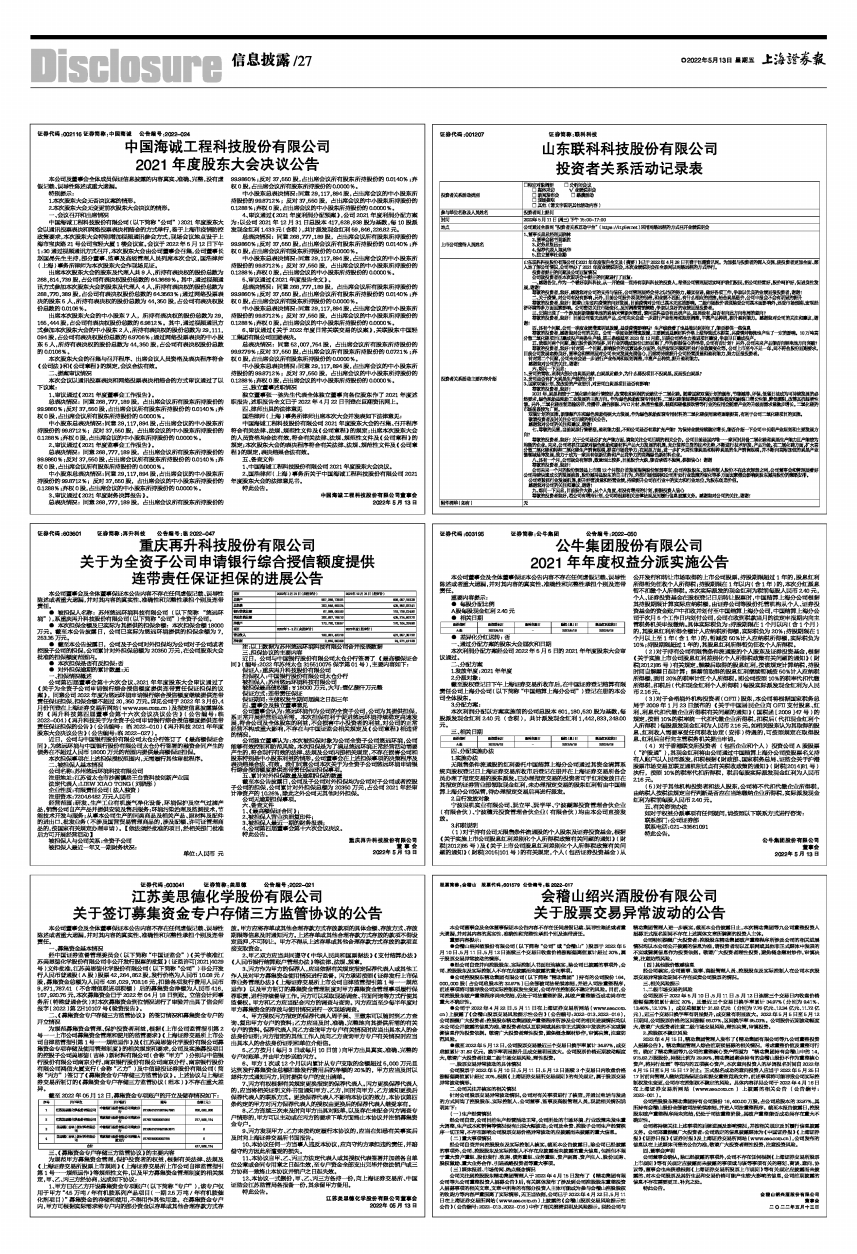 ●截至2022年5月12日,公司股票交易最近三个交易日换手率累计34.97%,成交总额累计31.82亿元,换手率明显提升且成交量明显放大。公司股票价格近期波动幅度大,敬请广大投资者注意二级市场交易风险,理性投资。