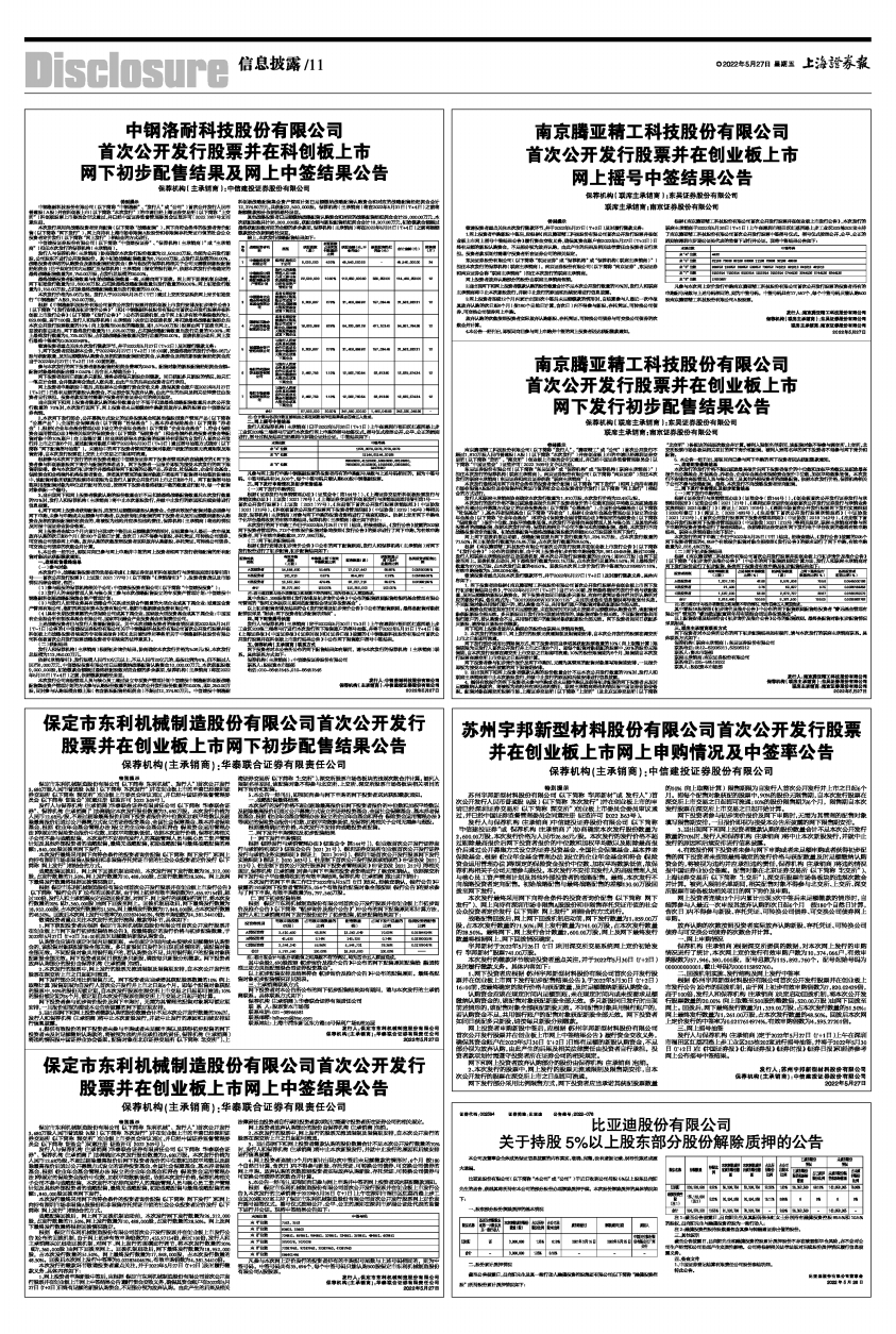 根据《南京腾亚精工科技股份有限公司首次公开发行股票并在创业板上市发行公告》,本次发行的联席主承销商于2022年5月26日(T+1日)上午在深圳市福田区红荔西路上步工业区203栋202室主持了南京腾亚精工科技股份有限公司首次公开发行股票中签摇号仪式。摇号仪式按照公开、公平、公正的原则在深圳市罗湖公证处代表的监督下进行并公证。现将中签结果公告如下:
