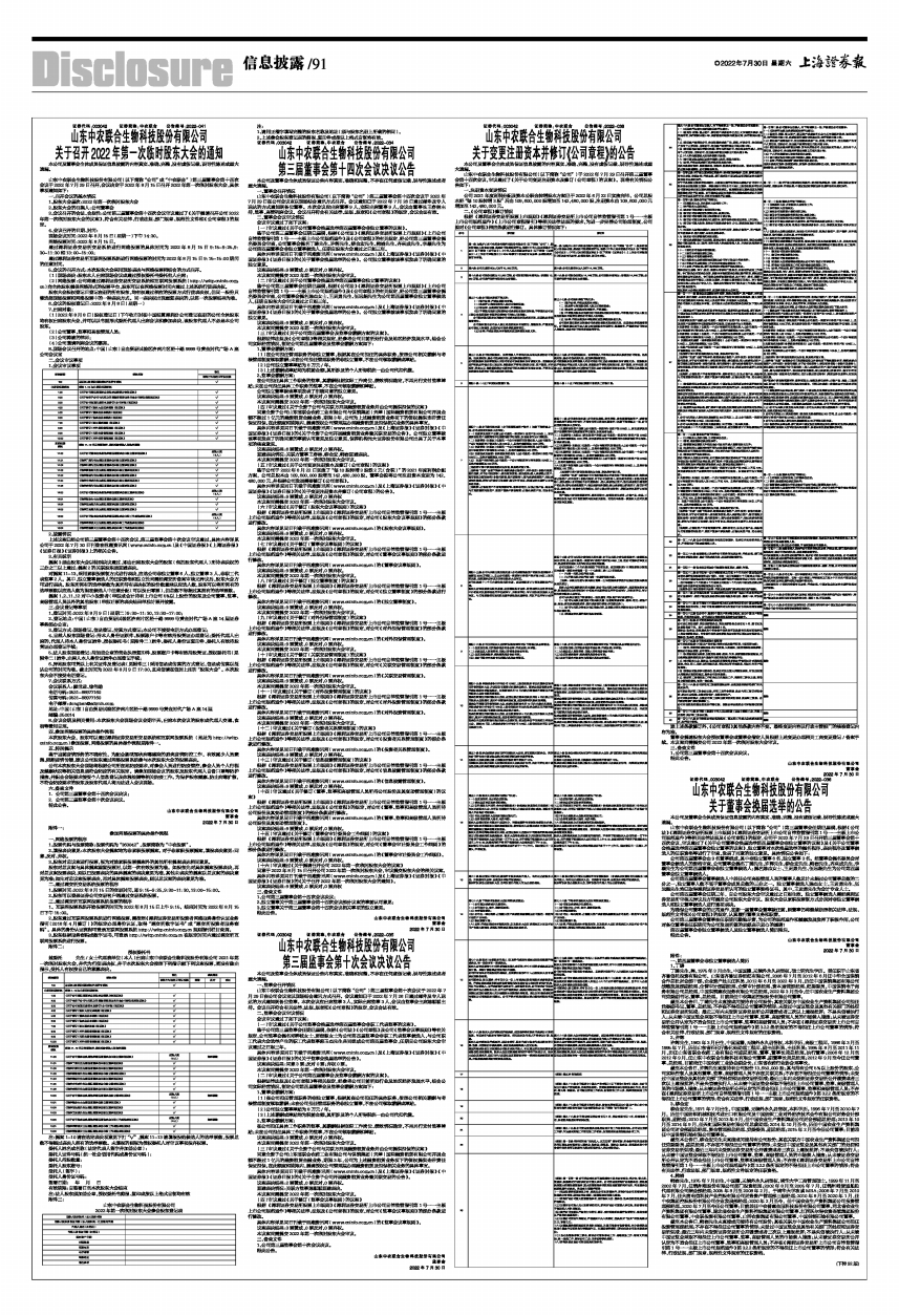 山东中农联合生物科技股份有限公司(以下简称“公司”或“中农联合”)第三届董事会第十四次会议于2022年7月29日召开,会议决定于2022年8月15日召开2022年第一次临时股东大会,具体事项通知如下:
