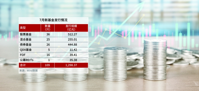 Wind统计数据显示,7月以来,新成立的公募基金数量达到109只,募集资金的总规模达到1298.37亿元,平均募资规模为11.91亿元。