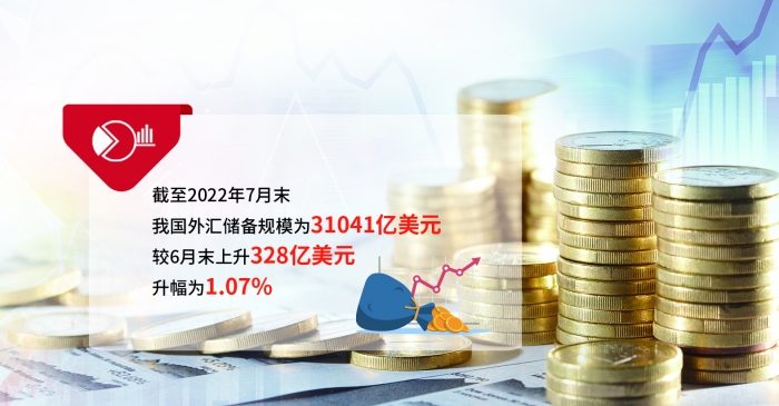 国家外汇管理局8月7日发布数据显示,截至2022年7月末,我国外汇储备规模为31041亿美元,较6月末上升328亿美元,升幅为1.07%。