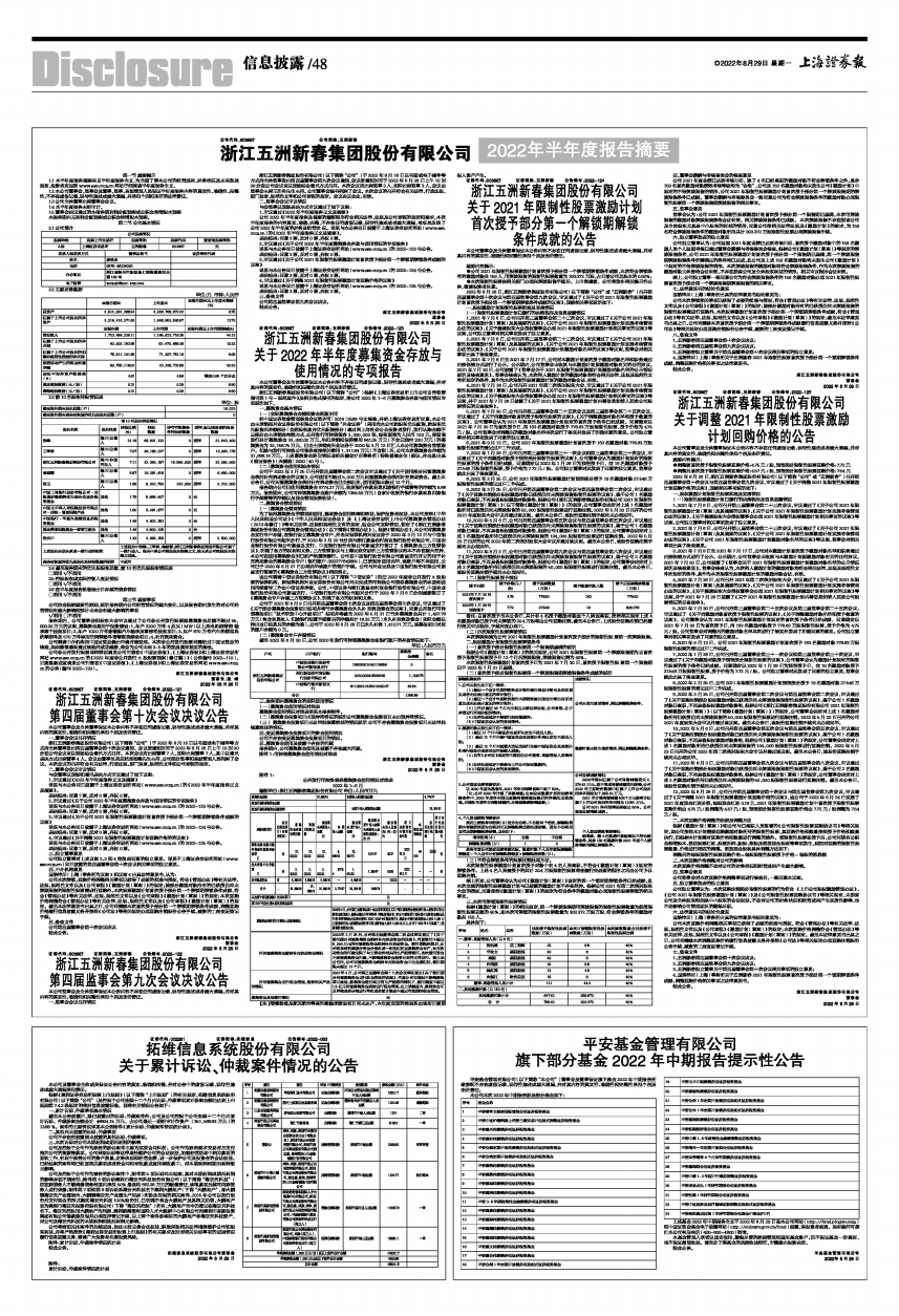 浙江五洲新春集团股份有限公司(以下简称“公司”)根据《上海证券交易所上市公司自律监管指引第1号-规范运作》及相关格式指引的规定,将公司 2022年 1-6 月募集资金存放与使用情况专项说明如下。