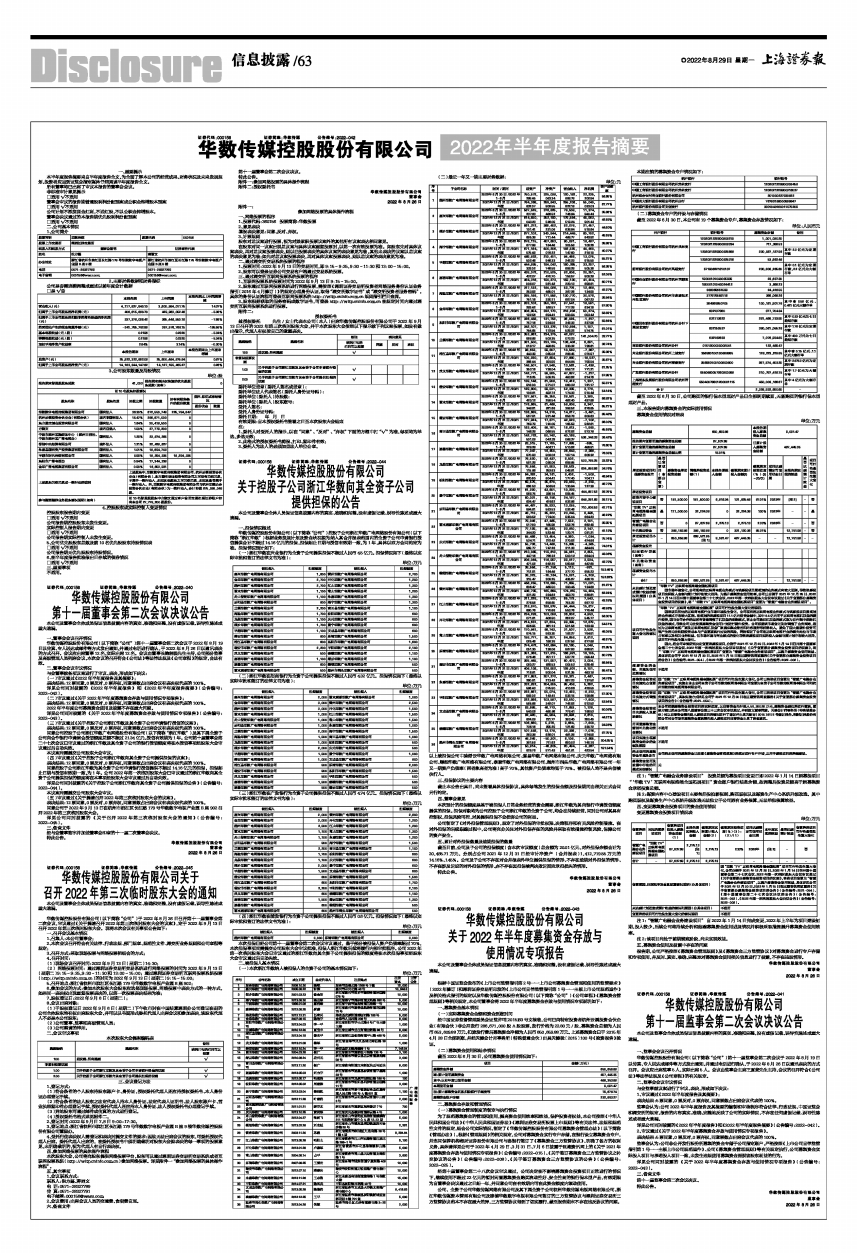 华数传媒控股股份有限公司(以下简称“公司”)第十一届监事会第二次会议于2022年8月19日以传真、专人送达或邮件等方式发出通知,并通过电话进行确认,于2022年8月26日以通讯表决的方式召开。会议应出席监事5人,实际出席5人。会议由监事会主席王夏斐先生主持,会议的召开符合《公司法》等法律法规及《公司章程》的有关规定。