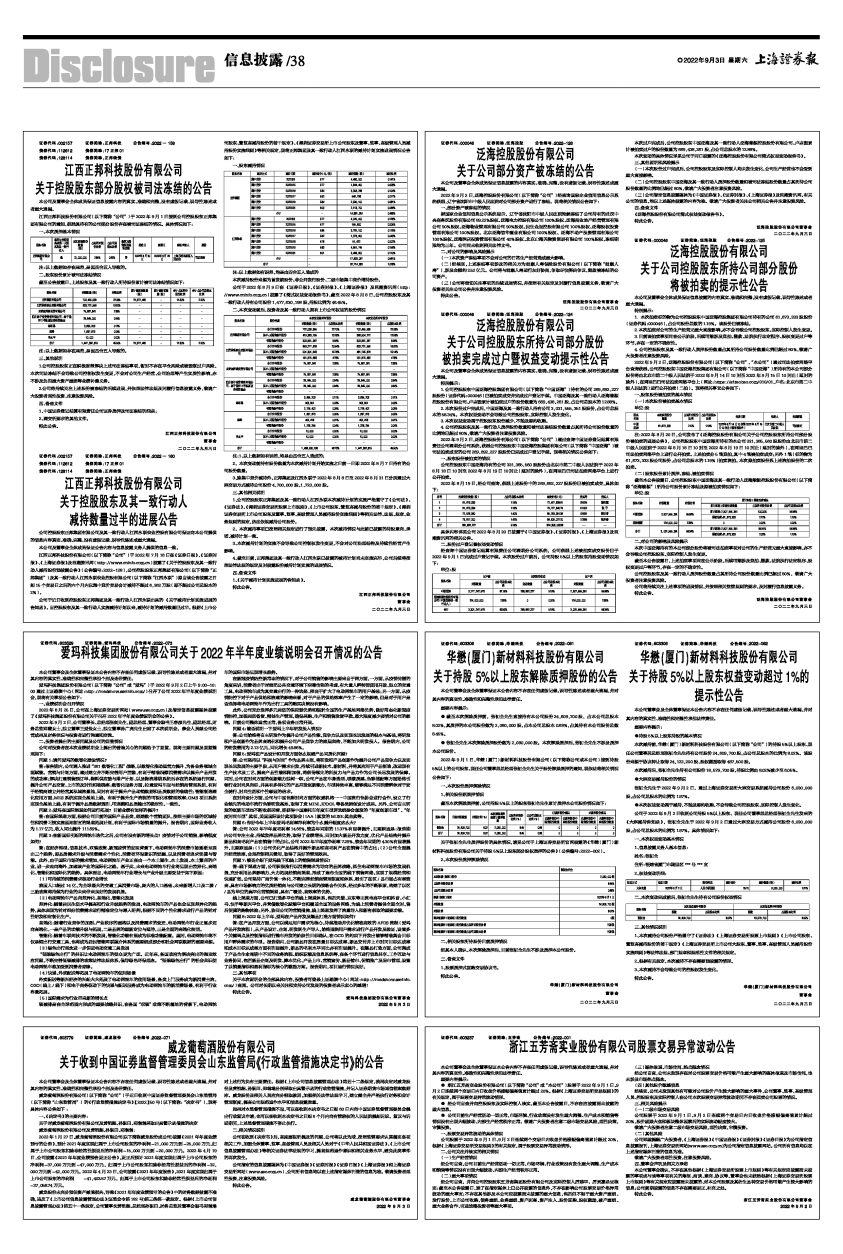 张初全先生于2022年9月2日,通过上海证券交易所大宗交易系统减持公司股份 6,030,000股,占公司总股本的比例为1.97%。