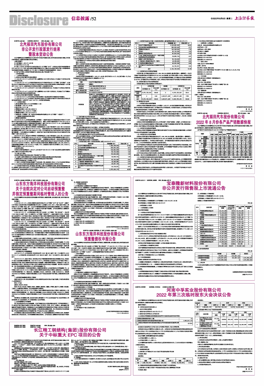 2、2022 年 9 月 5 日,公司收到烟台市莱山区人民法院(以下简称“莱山区法院”)送达的(2022)鲁 0613 破申 (预)1 号《通知书》(以下简称“《通知书》”),根据《通知书》内容,山东省高级人民法院作出《关于烟台市春达工贸有限公司申请山东东方海洋科技股份有限公司预重整一案移交管辖的批复》,同意烟台市中级人民法院将烟台市春达工贸有限公司申请山东东方海洋科技股份有限公司预重整一案交莱山区法院审理,在莱山区法院指定临时管理人后,即开始预重整工作。