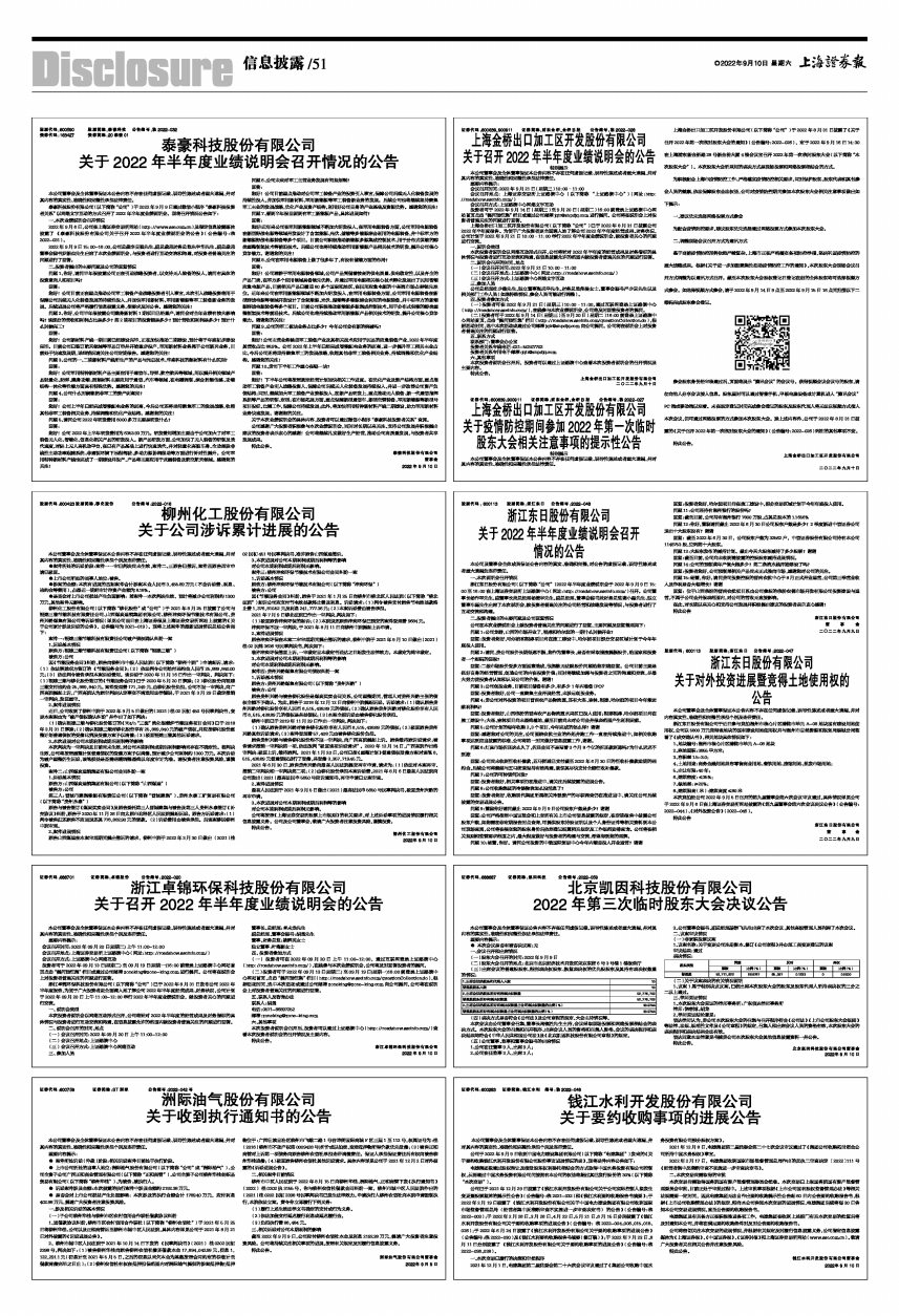 2022年9月6日,公司在上海证券交易所网站(http://www.sse.com.cn)及指定信息披露媒体披露了《泰豪科技股份有限公司关于召开2022年半年度业绩说明会的公告》(公告编号:临2022-031)。