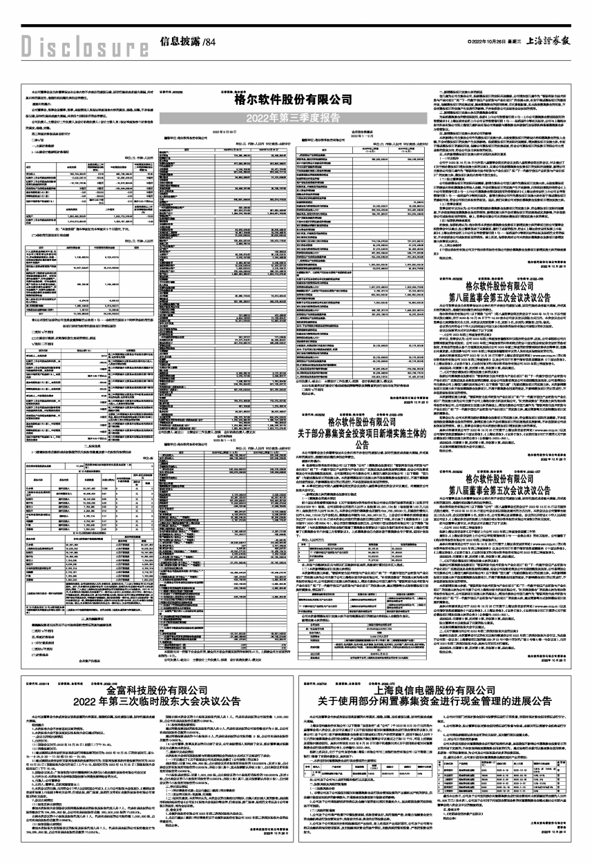 具体内容请详见公司于2022年10月26日刊登于上海证券交易所网站(www.sse.com.cn)的《格尔软件股份有限公司2022年第三季度报告》以及公司同日刊登于指定信息披露媒体《中国证券报》、《上海证券报》、《证券日报》、《证券时报》的《格尔软件股份有限公司2022年第三季度报告》。
