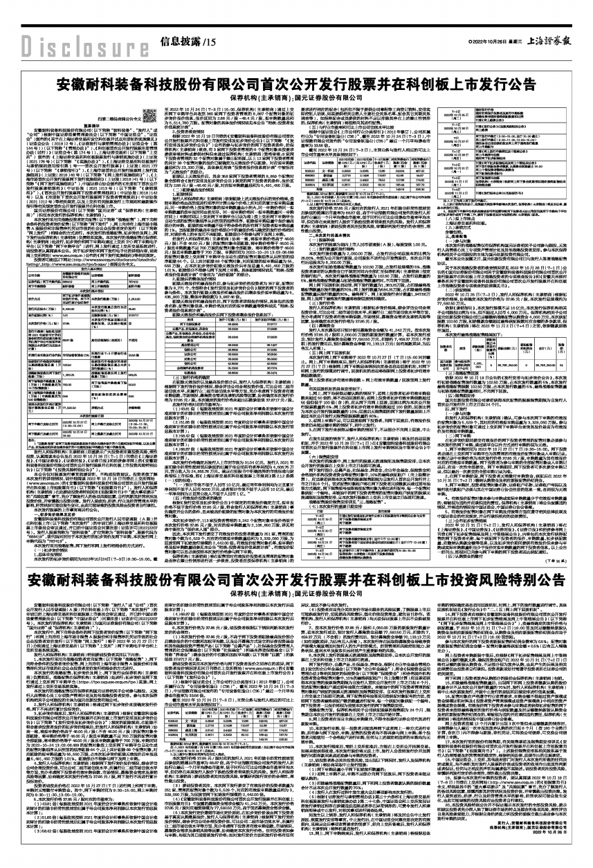 发行人和保荐机构(主承销商)郑重提示广大投资者注意投资风险,理性投资,认真阅读本公告及在2022年10月26日(T-1日)刊登在《上海证券报》、《中国证券报》、《证券时报》、《证券日报》和经济参考网上的《安徽耐科装备科技股份有限公司首次公开发行股票并在科创板上市投资风险特别公告》(以下简称“《投资风险特别公告》”)。