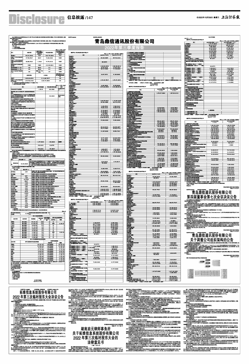 具体内容详见同日刊登于上海证券交易所网站(http://www.sse.com.cn)上的《青岛鼎信通讯股份有限公司2022年第三季度报告》。