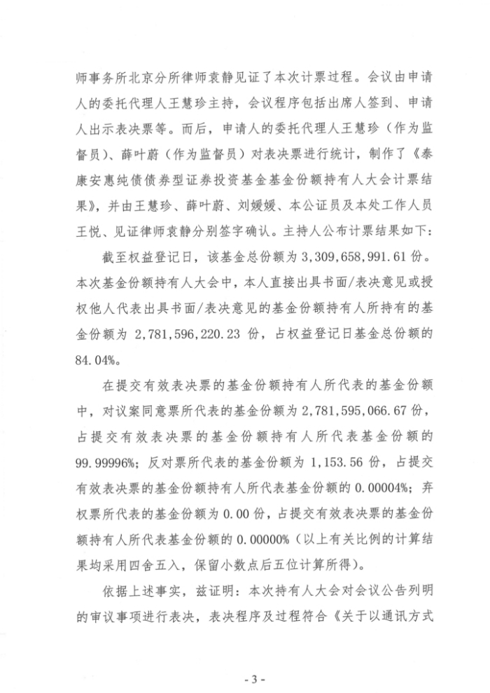 泰康资产管理有限责任公司(以下简称“基金管理人”)以通讯方式召开了本基金基金份额持有人大会,审议了《关于泰康安惠纯债债券型证券投资基金变更基金管理人有关事项的议案》。大会投票表决起止时间为自2022年8月26日起至2022年10月21日17:00止。2022年10月24日,在本基金的基金托管人交通银行股份有限公司授权代表的监督下,基金管理人对本次大会表决进行了计票,北京市方圆公证处对计票过程及结果进行了公证,上海市通力律师事务所对计票过程进行了见证。本次持有人大会的权益登记日为2022年8月18日,即在2022年8月18日下午交易时间结束后,在本基金注册登记机构登记在册的本基金全体基金份额持有人均有权参加本次基金份额持有人大会并投票表决。计票结果如下: