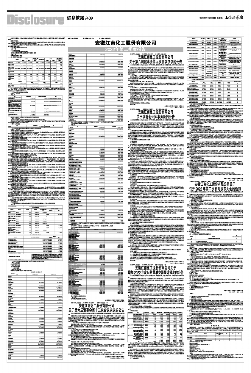 具体内容详见2022年10月28日公司登载于《证券时报》、《中国证券报》、《证券日报》、《上海证券报》和巨潮资讯网的《安徽江南化工股份有限公司2022年第三季度报告》(公告编号:2022-046)。