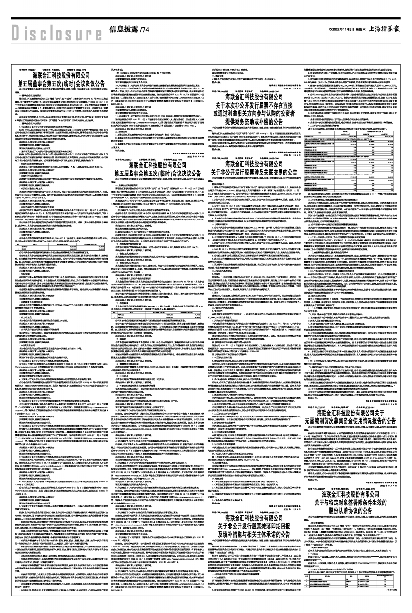 详见公司2022年11月5日披露于《中国证券报》、《上海证券报》、《证券时报》、《证券日报》及巨潮资讯网(http://www.cninfo.com.cn)上的《海联金汇科技股份有限公司关于与特定对象签署附条件生效的股份认购协议的公告》(公告编号:2022-078)