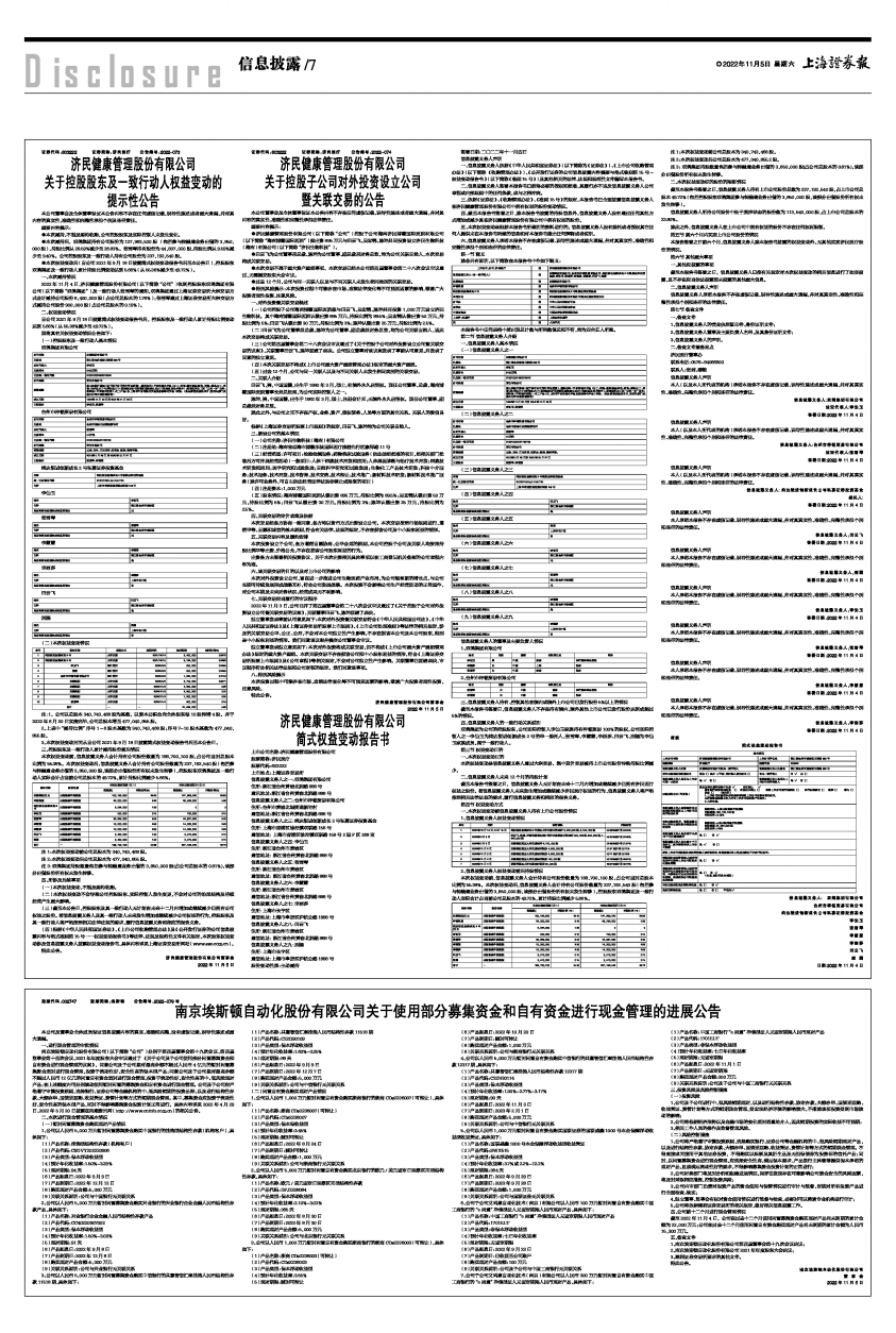 2022年11月4日,济民健康管理股份有限公司(以下简称“公司”)收到控股股东双鸽集团有限公司(以下简称“双鸽集团”)及一致行动人张雪琴的通知,双鸽集团通过上海证券交易所大宗交易方式合计减持公司股份8,400,000股(占公司总股本的1.76%);张雪琴通过上海证券交易所大宗交易方式减持公司股份900,000股(占公司总股本的0.19%)。