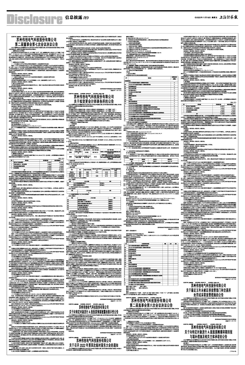 上述议案经公司第二届董事会第七次会议、第二届监事会第六次会议审议通过,详见公司于2022年11月18日刊载于《中国证券报》《上海证券报》《证券日报》《证券时报》及上海证券交易所网站(www.sse.com.cn)的相关公告及文件。公司将在2022年第四次临时股东大会召开前,在上海证券交易所网站(www.sse.com.cn)披露《苏州伟创电气科技股份有限公司2022年第四次临时股东大会会议资料》。