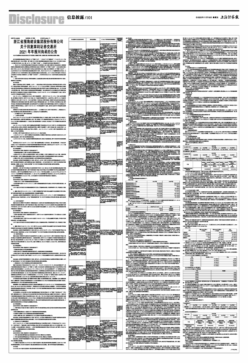 浙江省围海建设集团股份有限公司(以下简称“公司”、“上市公司”或“围海股份”)于2022年5月5日收到深圳证券交易所上市公司管理一部下发的《关于对浙江省围海建设集团股份有限公司2021年年报的问询函》(公司部年报问询函〔2022〕第 184 号)(以下简称“问询函”)。问询函的主要内容及问题回复如下: