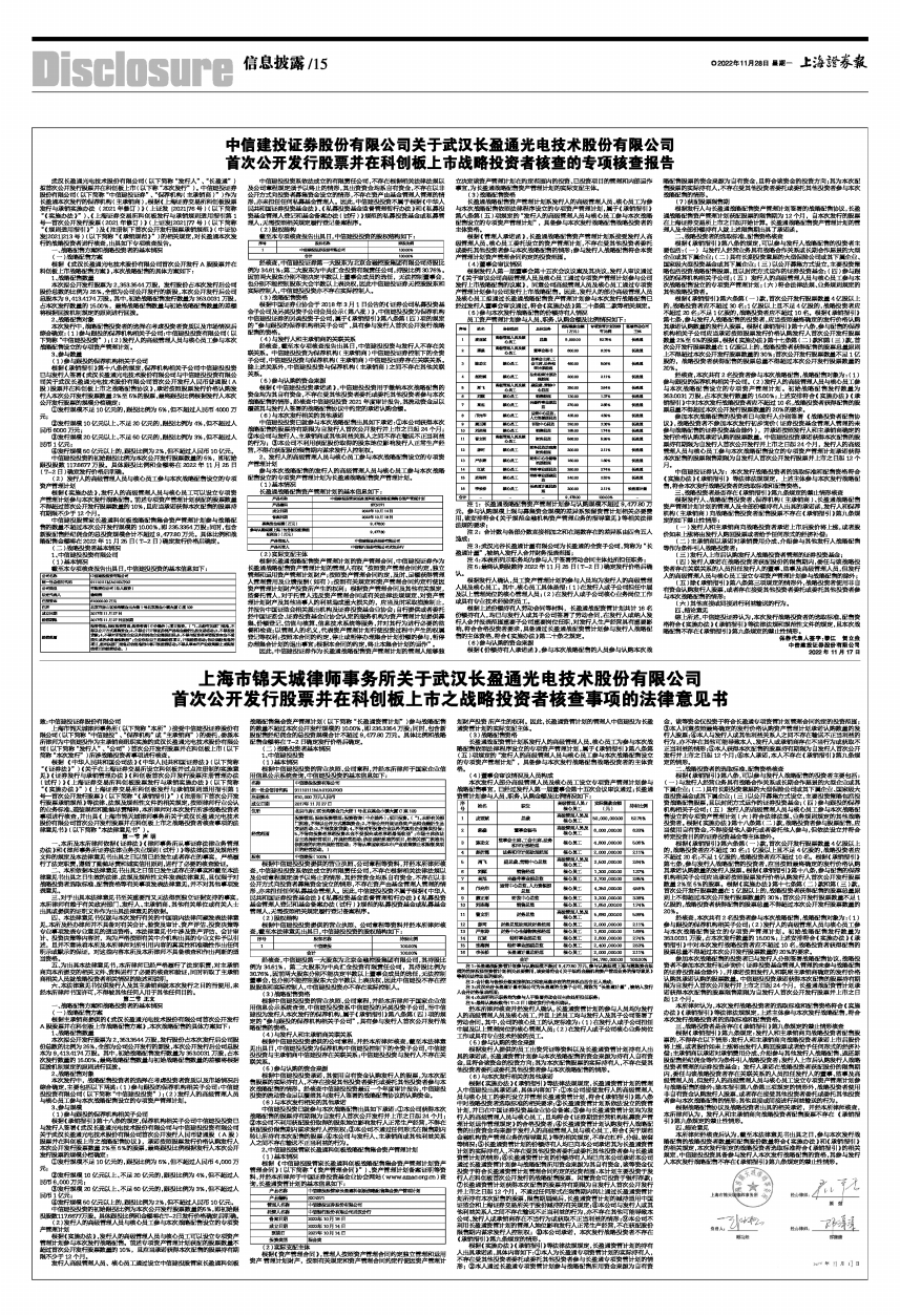 武汉长盈通光电技术股份有限公司(以下简称“发行人”、“长盈通”)拟首次公开发行股票并在科创板上市(以下称“本次发行”)。中信建投证券股份有限公司(以下简称“中信建投证券”、“保荐机构(主承销商)”)作为长盈通本次发行的保荐机构(主承销商),根据《上海证券交易所科创板股票发行与承销实施办法(2021年修订)》(上证发[2021]76号)(以下简称“《实施办法》”)、《上海证券交易所科创板发行与承销规则适用指引第1号—首次公开发行股票(2021年修订)》(上证发[2021]77号)(以下简称“《规则适用指引》”)及《注册制下首次公开发行股票承销规范》(中证协发[2021]213号)(以下简称“《承销规范》”)的相关规定,对长盈通本次发行的战略投资者进行核查,出具如下专项核查报告。