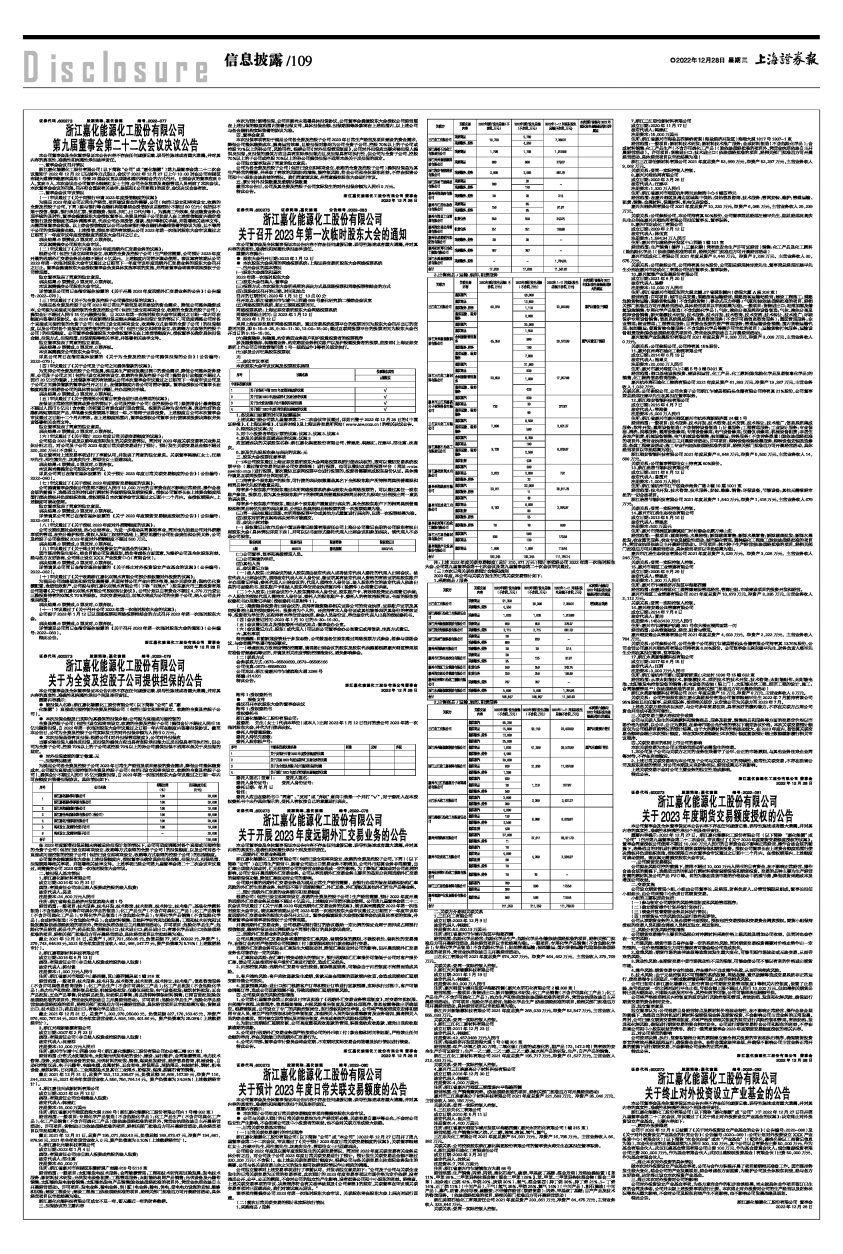 浙江嘉化能源化工股份有限公司(以下简称“公司”或“嘉化能源”)第九届董事会第二十二次会议通知于2022年12月22日以邮件方式发出,会议于2022年12月27日上午10:00时在公司南湖区南湖大道槜李路嘉南美地1号楼29层会议室以现场和通讯相结合的方式召开。出席会议的董事应到9人,实到9人,本次会议由公司董事长韩建红女士主持,公司全体监事及高级管理人员列席了本次会议。本次董事会会议的召集、召开符合国家有关法律、法规和《公司章程》的规定,会议决议合法有效。