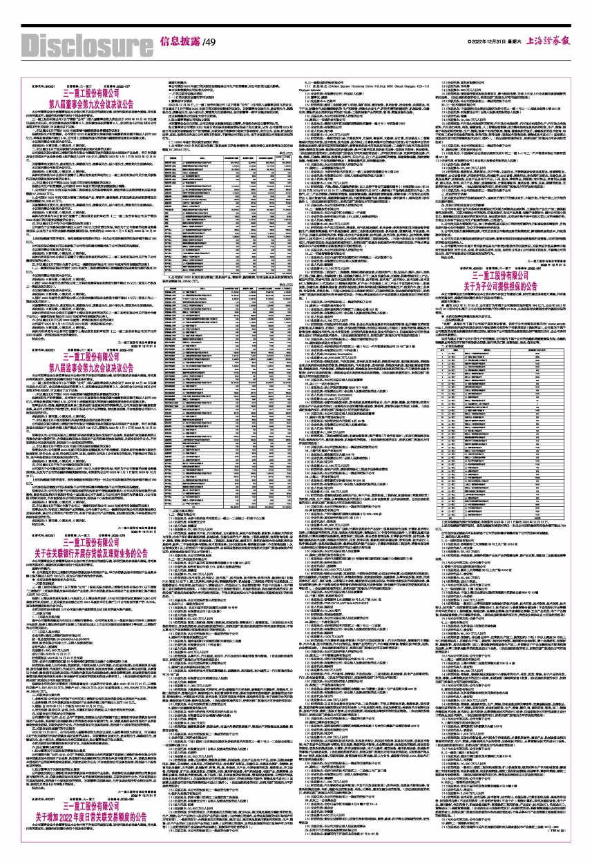 三一重工股份有限公司(以下简称“公司”)第八届监事会第九次会议于2022年12月30日以通讯表决方式召开。会议应参加表决的监事3人,实际参加表决的监事3人。会议符合《公司法》和《公司章程》的有关规定,审议通过了以下议案: