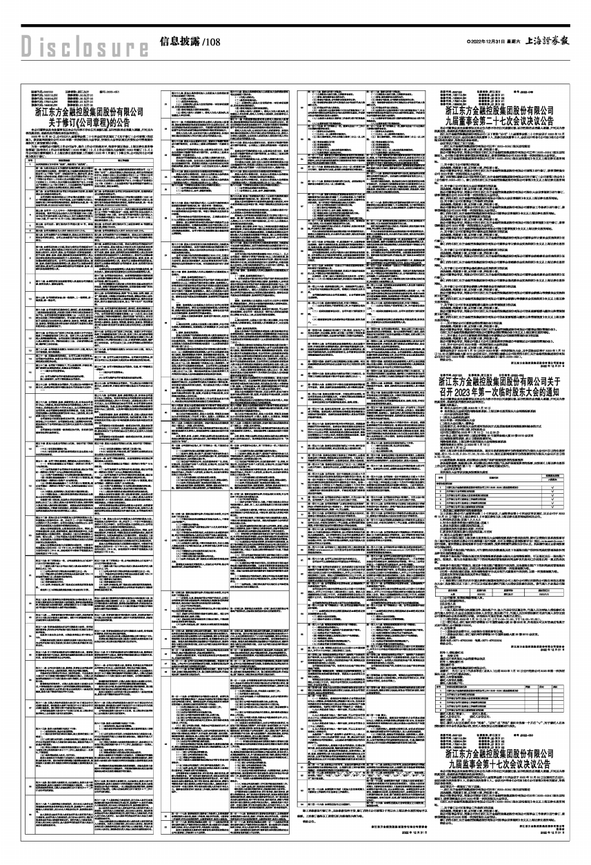 经公司董事会审议,同意公司对《浙江东方金融控股集团股份有限公司章程》进行修订,该事项需提交公司2023年第一次临时股东大会审议。