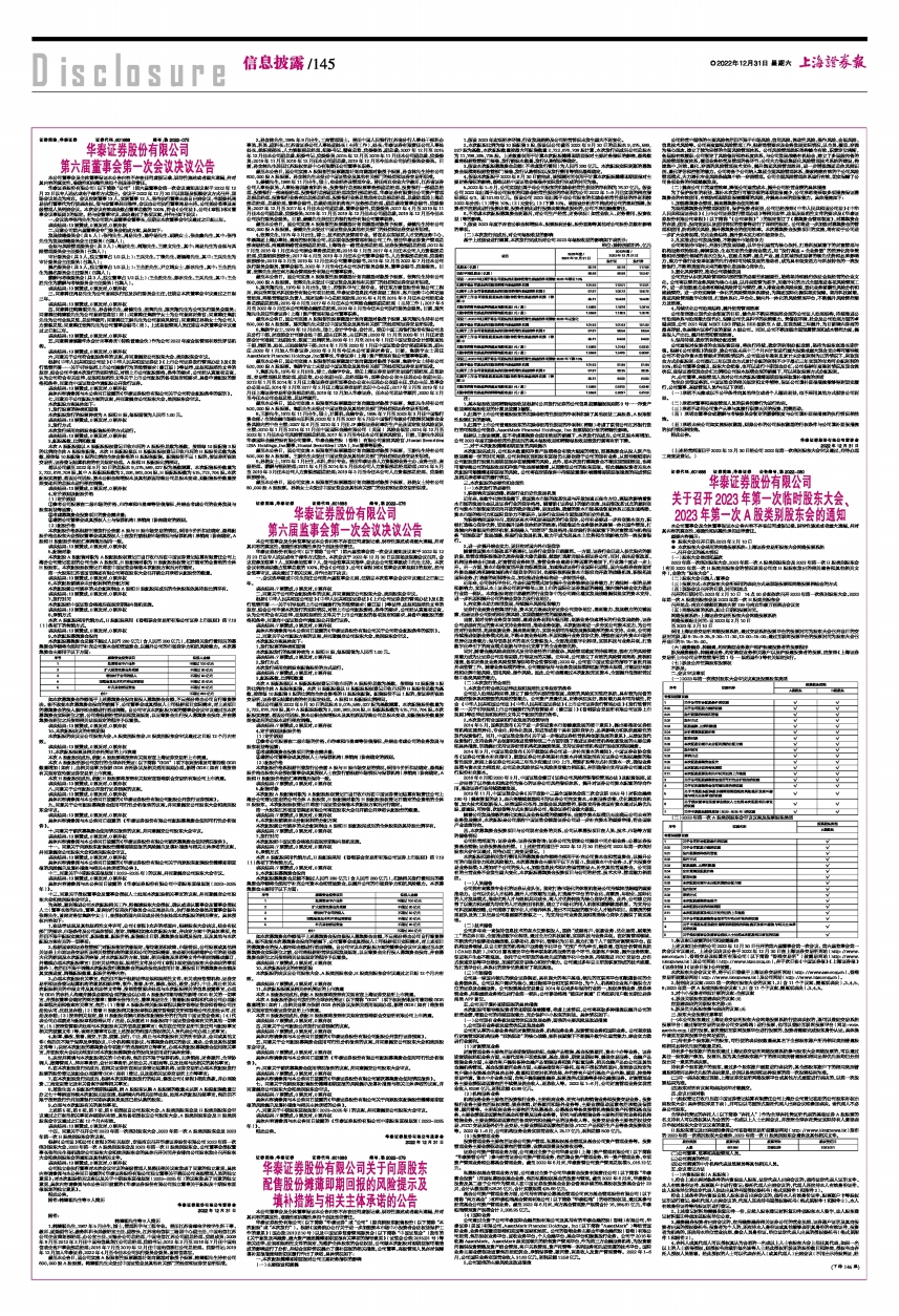 上述议案已分别经公司2022年12月30日召开的第六届董事会第一次会议、 第六届监事会第一次会议审议通过。上述会议决议公告于2022年12月30日在上海证券交易所网站(http://www.sse.com.cn)、香港交易及结算所有限公司(以下简称“香港交易所”)披露易网站(http://www.hkexnews.hk)及公司网站(http://www.htsc.com.cn),并于次日在《中国证券报》《上海证券报》《证券时报》《证券日报》公开披露。
