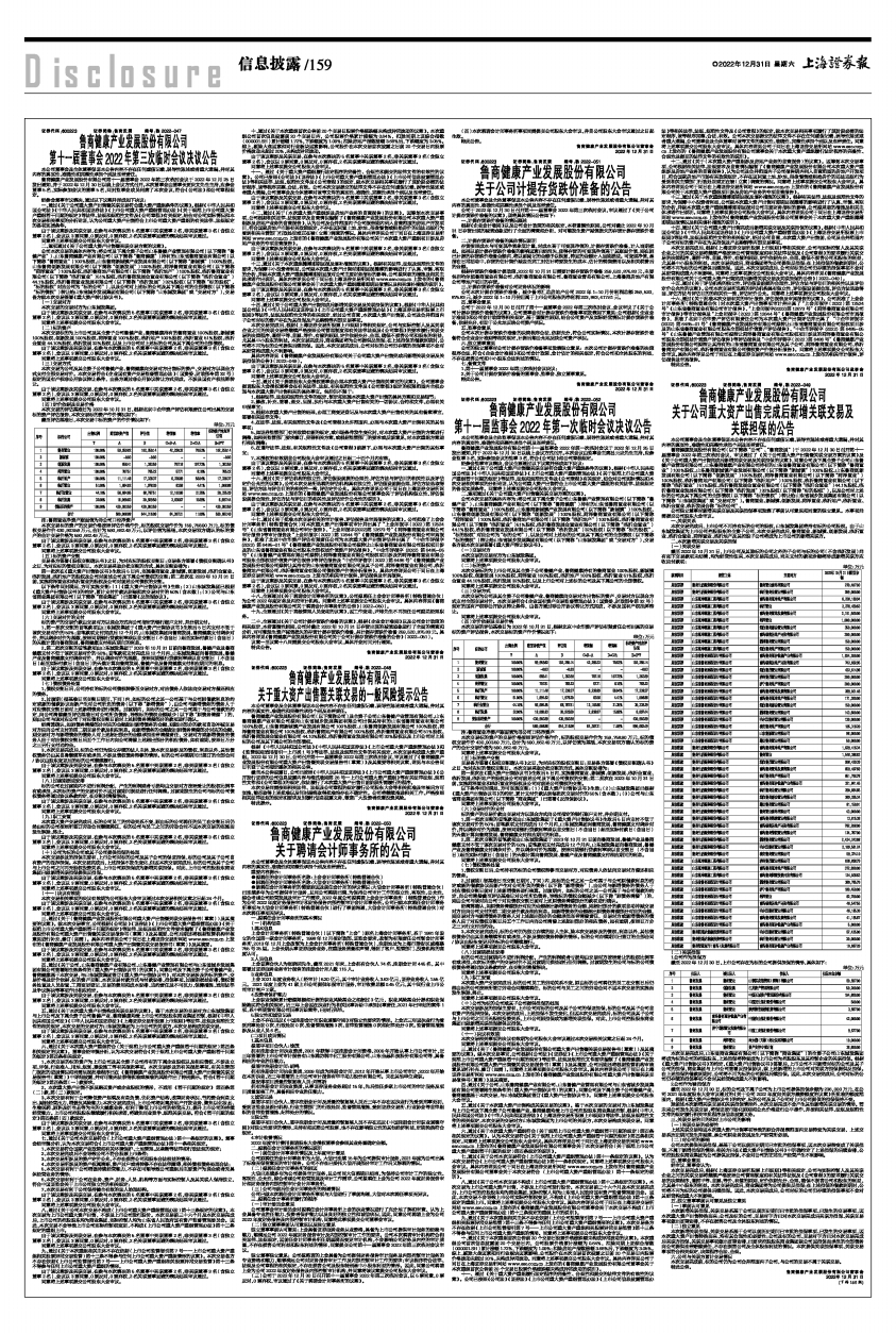 十六、通过《关于批准本次交易有关的审计报告、评估报告及审阅报告的议案》。公司批准了上会会计师事务所(特殊普通合伙)对本次重大资产出售事项审计并出具了“上会师报字(2022)第12524号”《山东省鲁商置业有限公司审计报告》、“上会师报字(2022)第12673号”《菏泽鲁商置业有限公司审计报告》等审计报告及“上会师报字(2022)第12644号”《鲁商健康产业发展股份有限公司审阅报告》,批准了北京中企华资产评估有限责任公司为本次重大资产出售评估并出具了“中企华评报字(2022)第6485-01号”《鲁商健康产业发展股份有限公司拟转让山东省鲁商置业有限公司股权项目涉及的山东省鲁商置业有限公司股东全部权益价值资产评估报告》、“中企华评报字(2022)第6485-05号”《山东鲁健产业管理有限公司拟转让菏泽鲁商置业有限公司股权项目涉及的菏泽鲁商置业有限公司股东全部权益价值资产评估报告》等评估报告及“中企华评咨字(2022)第6486号”《鲁商健康产业发展股份有限公司拟转让其持有的山东省鲁商置业有限公司及其子公司、菏泽鲁商置业有限公司、临沂鲁商地产有限公司、临沂鲁商置业有限公司债权资产价值分析报告》。同意将上述事项提交公司股东大会审议。具体内容详见公司于同日在上海证券交易所网站 www.sse.com.cn 上发布的相关审计报告、评估报告及审阅报告。