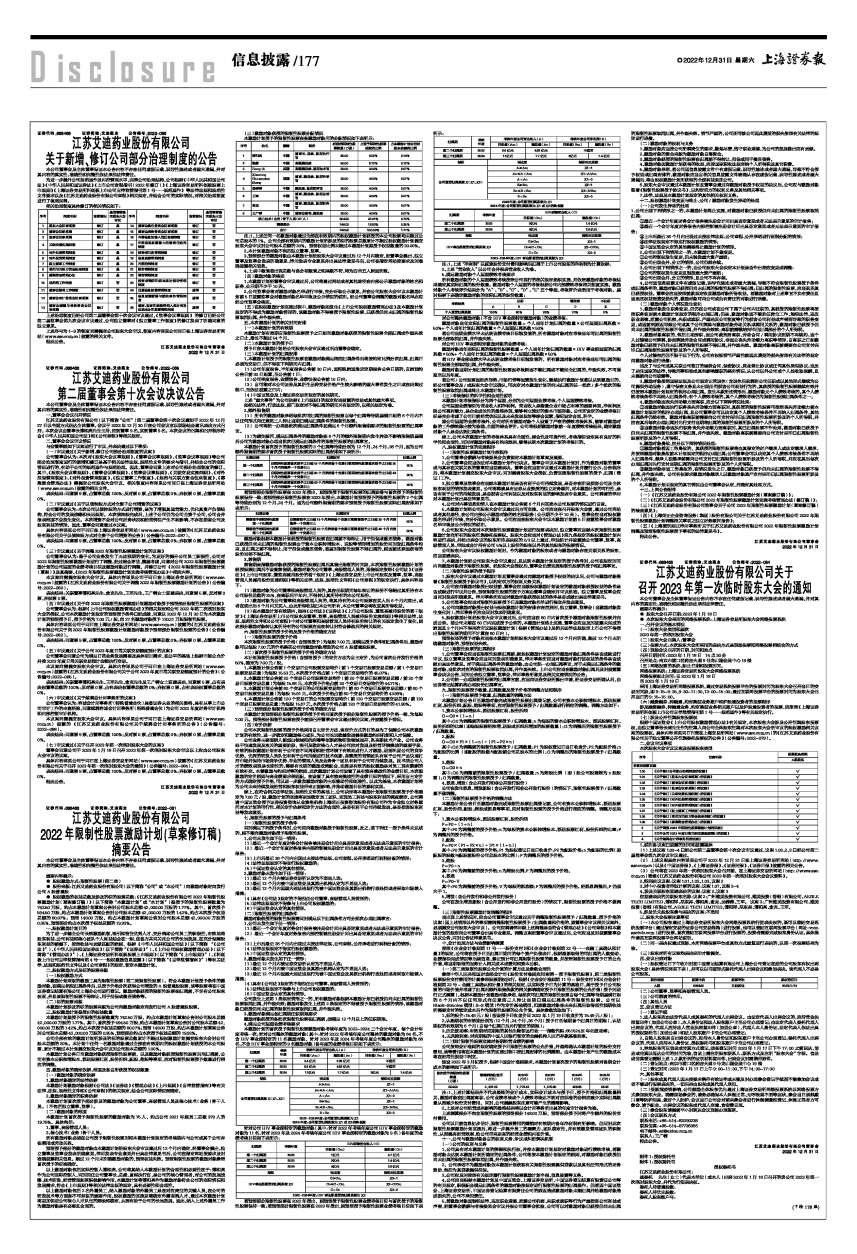 具体内容详见公司于同日在上海证券交易所网站(www.sse.com.cn)披露的《江苏艾迪药业股份有限公司关于召开2023年第一次临时股东大会的通知》(公告编号:2022-084)。