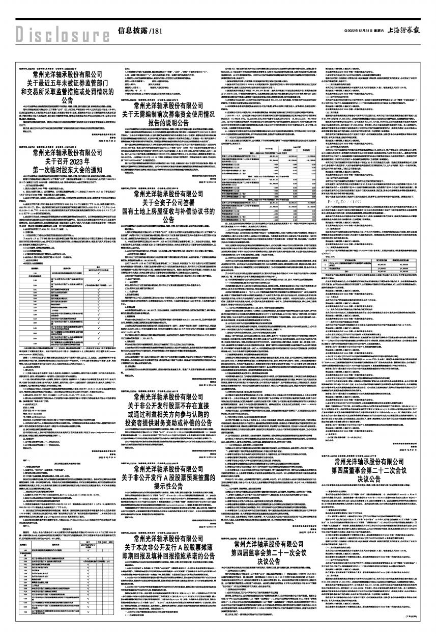 常州光洋轴承股份有限公司(以下简称“公司”)第四届董事会第二十二次会议通知于2022年12月26日以邮件和微信方式发出,经全体董事一致同意会议于2022年12月30日在常州市新北区汉江路52号公司一号会议室以现场和通讯方式召开,会议应出席董事9名,实际出席董事9名。会议由董事长李树华先生召集并主持,公司的监事和高级管理人员列席了本次会议。本次会议的召集、召开与表决程序符合法律法规的有关规定,会议合法有效。