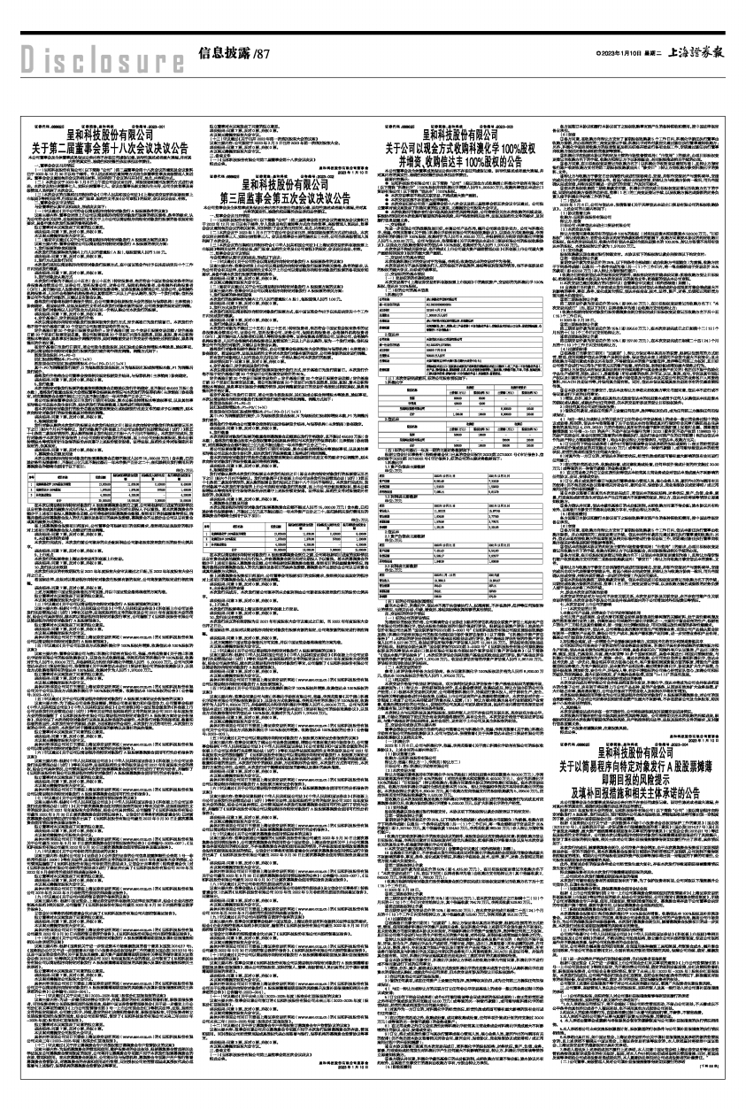 具体内容详见公司同日刊登在上海证券交易所网站(www.sse.com.cn)的《呈和科技股份有限公司关于公司以现金方式收购科澳化学100%股权并增资、收购信达丰100%股权的公告》(公告编号:2023-003)。