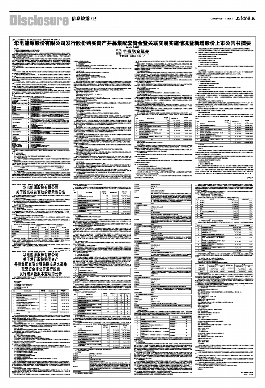 三、根据中登公司上海分公司2023年1月6日出具的《中国证券登记结算有限责任公司上海分公司证券变更登记证明》,根据华电能源送达的证券变更登记数据和相关资料,中登公司上海分公司已完成证券变更登记。华电能源本次募集配套资金发行股份数量为1,212,669,683股,均为有限售条件的流通股。本次发行完成后,公司总股本增加至7,907,336,210股。
