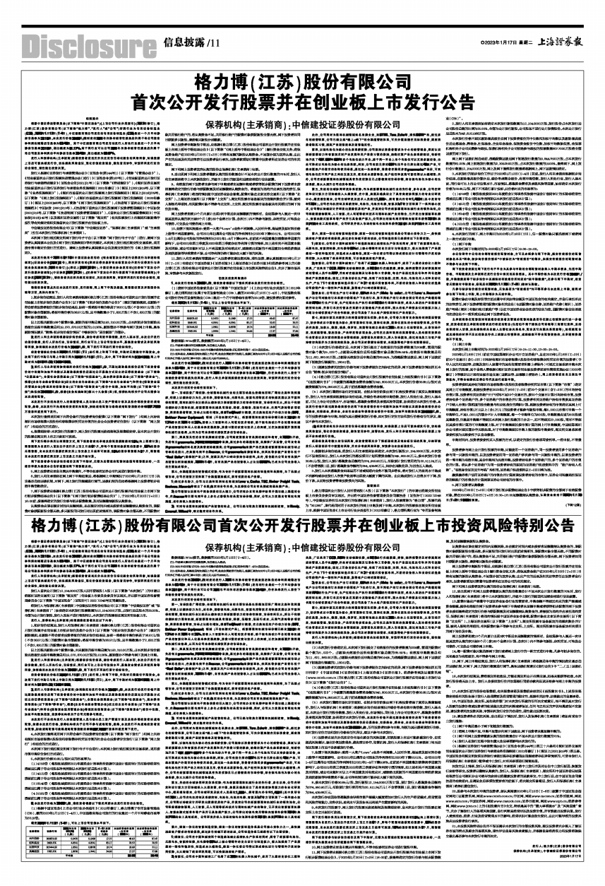 11、发行人和主承销商郑重提示广大投资者注意投资风险,理性投资,请认真阅读2023年1月17日(T-1日)刊登在《中国证券报》《证券时报》《上海证券报》《证券日报》和经济参考网上的《格力博(江苏)股份有限公司首次公开发行股票并在创业板上市投资风险特别公告》,充分了解市场风险,审慎参与本次新股发行。