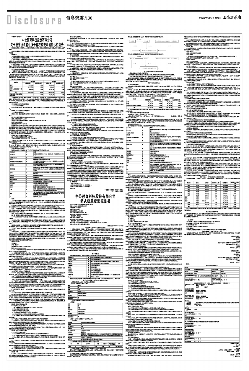 中公教育科技股份有限公司(以下简称“公司”、“上市公司”)于近日接到公司控股股东、实际控制人鲁忠芳女士的通知,获悉鲁忠芳女士于2023年1月12日与陕西省国际信托股份有限公司(代表“陕国投·云起1号证券投资集合资金信托计划”)(以下简称“受让方”)签订了《股份转让协议》,该协议约定,鲁忠芳女士拟将其持有的上市公司314,537,300股的无限售流通股股份(占上市公司股份总数的5.10%)协议转让给受让方。