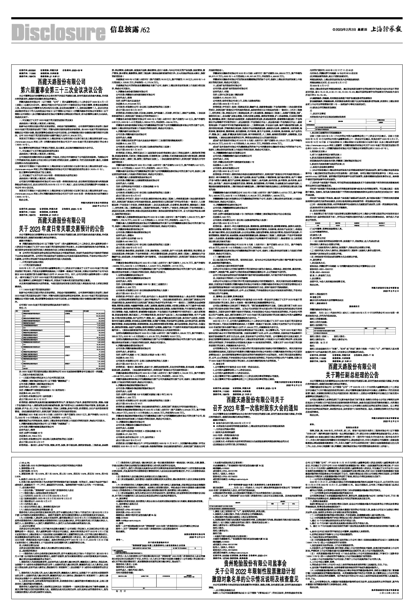 详见同日刊登在《中国证券报》《上海证券报》《证券时报》《证券日报》及上海证券交易所http://www.sse.com.cn网站上的《西藏天路股份有限公司关于召开2023年第一次临时股东大会的通知》(2023-12号)。