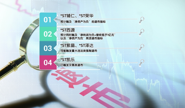 2月2日晚间,*ST凯乐公告称,公司股价连续20个交易日低于1元,已触及交易类退市指标,预计成为2023年第一只退市股。市场“用脚投票”的背后,是公司丧失持续经营能力、资不抵债,同时涉嫌违法违规。公司2016年至2020年间合计虚增营业收入达512.25亿元,面临财务类退市和重大违法退市双重风险。与之类似,*ST西源、*ST辅仁以及*ST荣华在业绩预告锁定退市后股价便开始连续跌停,其中*ST西源、*ST荣华均已跌破面值,发布了可能触及交易类退市的风险提示公告。