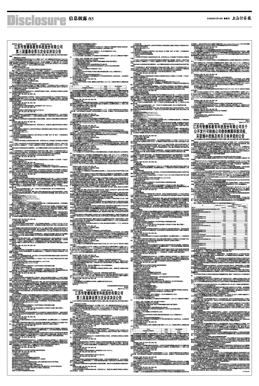 江苏传智播客教育科技股份有限公司(以下简称“公司”)第三届监事会第五次会议于2023年2月12日以电子邮件等形式发出会议通知,于2023年2月15日14:00在北京市昌平区建材城西路金燕龙写字楼会议室以现场及通讯相结合的方式召开。会议应出席监事3名,实际出席3名,会议由监事会主席张鹏先生主持。会议的召集、召开符合《中华人民共和国公司法》(以下简称“《公司法》”)及《公司章程》的有关规定。