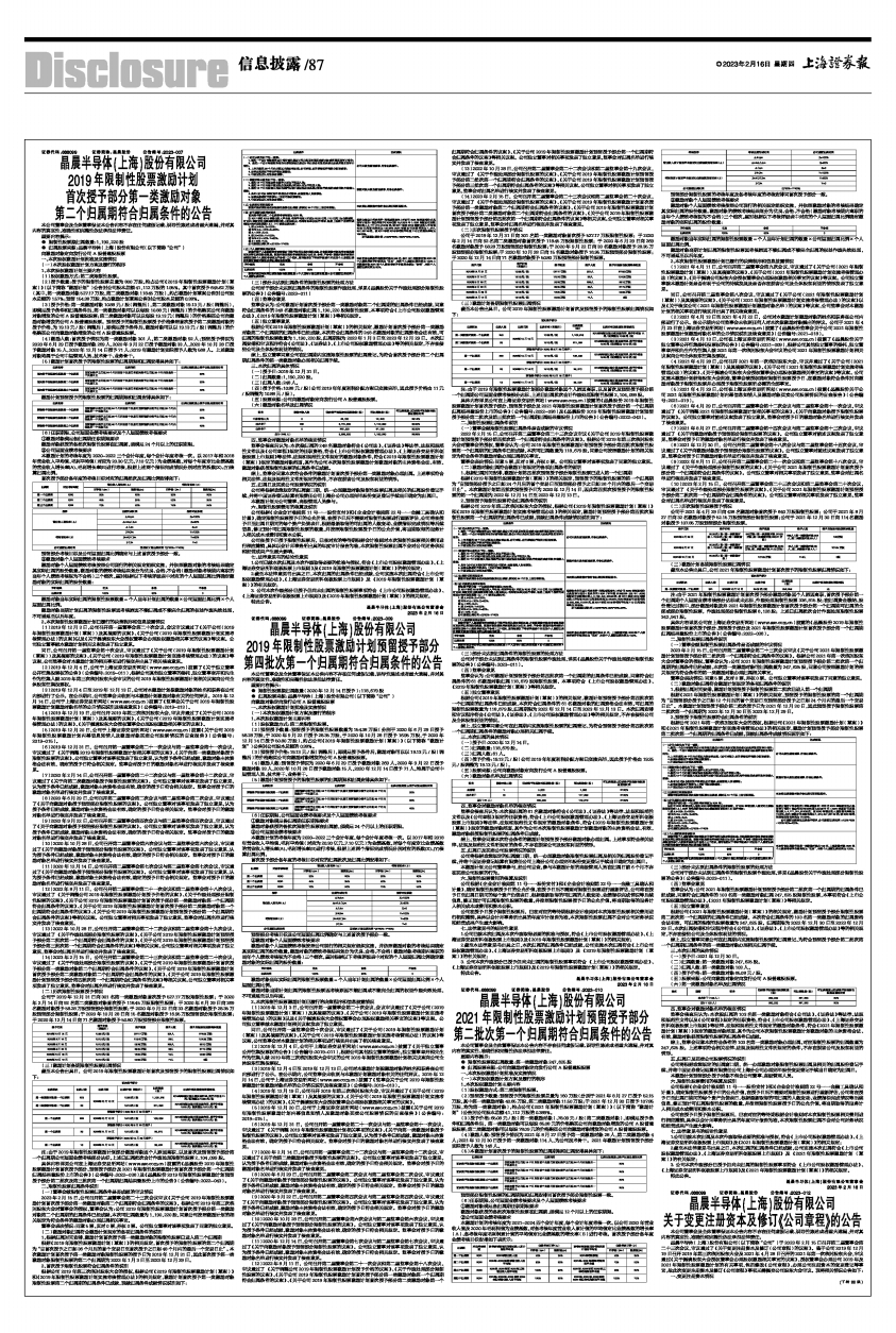 具体内容详见公司在上海证券交易所网站(www.sse.com.cn)披露的《晶晨股份2019年限制性股票激励计划首次授予部分、预留授予部分及2021年限制性股票激励计划首次授予部分第一个归属期归属结果暨股份上市的公告》(公告编号:2022-036)。
