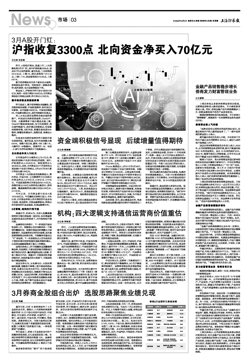 3月A股开门红:沪指收复3300点 北向资金净买入70亿元